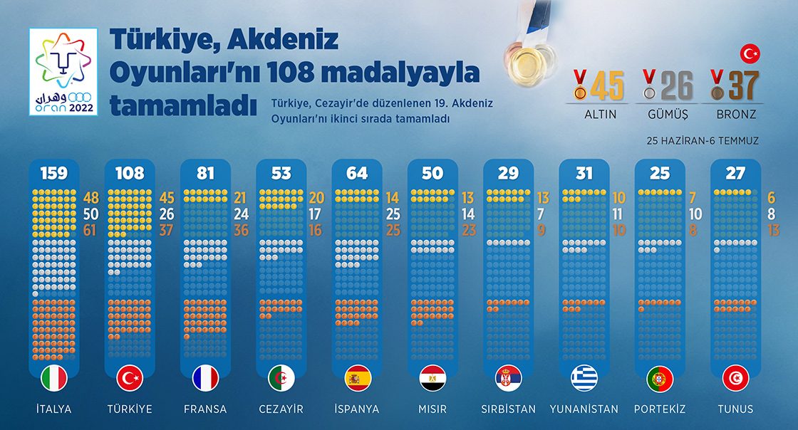 Oran’da, İtalya 48 altın, 50 gümüş ve 61 bronz toplam 159 madalyayla birinci olurken, üçüncülüğü ise 21 altın, 24 gümüş ve 36 bronz toplam 81 madalya kazanan Fransa elde etti.