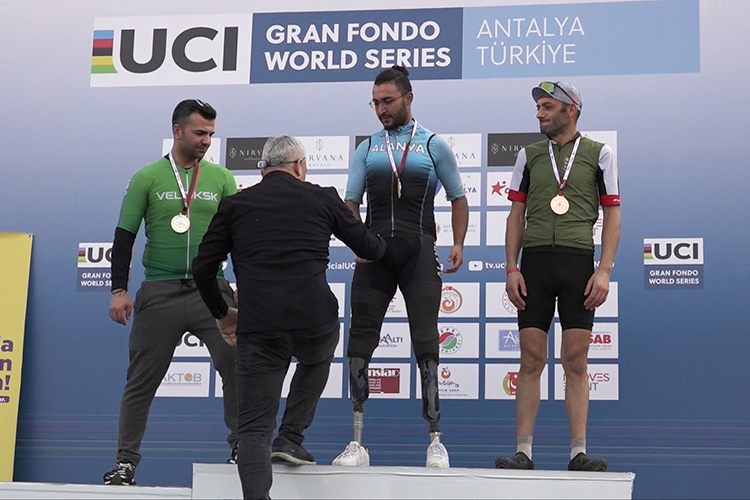 Antalya’da düzenlenen Uluslararası Bisiklet Birliği (UCI) Nirvana Gran Fondo World Series’te 70 kilometrelik para bisiklet yarışının 19-34 yaş grubu şampiyonu Fırat Uğur, protezlerle pedal çevirerek ulaştığı başarılarla...