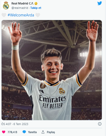 Real Madrid Kulübü’nün Twitter hesabından önceki gün paylaşılan ve Arda Güler’in formalı fotoğrafın yer aldığı tweet kulübün sosyal medya hesabının en çok beğeni alan tweeti olarak tarihe geçti. ‘WelcomeArda’ hashtagiyle paylaşılan tweet dün saat 16.00’ya kadar tam 736 bin 600 beğeni aldı ve Benzema'nın golü sonrası atılan tweetin beğeni sayısını geride bıraktı.