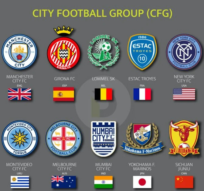 Manchester City, New York City, Melborne City, Yokohama F. Marinos, Montevideo City Torque, Girona FC, Schuan Jiuniu, Mumbai City FC, Lommel SK, Esparence Sportive Troyes, Palermo, Bahia, Club Bolivar City Futbol Grup bünyesinde olan kulüpler..