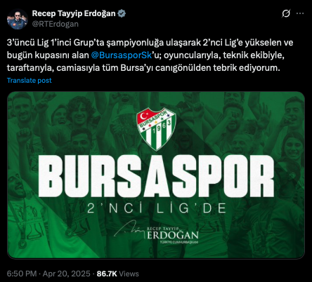 Cumhurbaşkanı ve AKP Genel Başkanı Recep Tayyip Erdoğan, 3. Lig 1. Grup'ta şampiyonluğa ulaşarak 2. Lig'e yükselen ve bugün kupasını alan Bursaspor için tebrik mesajı yayımladı.