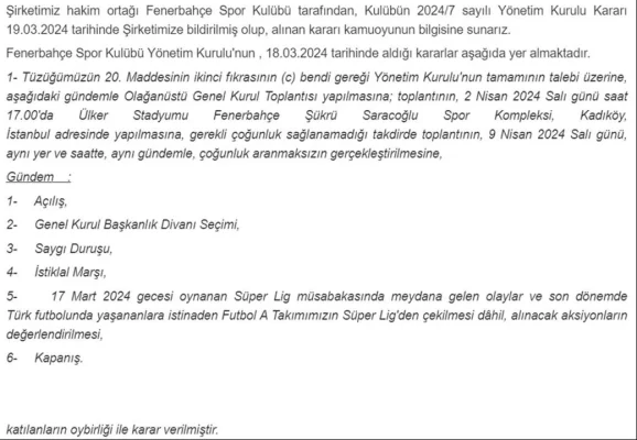 "Şirketimiz hakim ortağı Fenerbahçe Spor Kulübü tarafından, Kulübün 2024/7 sayılı Yönetim Kurulu Kararı 19.03.2024 tarihinde Şirketimize bildirilmiş olup, alınan kararı kamuoyunun bilgisine sunarız.