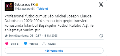 Galatasaray'ın yeni sezon planlamasında düşünmediği Fransız oyuncu Leo Dubois'in Başakşehir'e kiralandı.