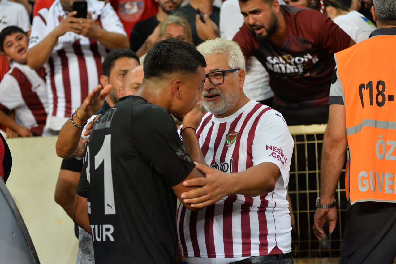 Maçın ardından Hataysporlu Oğuzhan Matur, tribünde bulunan depremzede babası Mehmet Matur’un yanına gitti. Baba Mehmet Matur da tribünden inerek, Hataysporlu oğluna sarılıp, galibiyeti gözyaşları içinde kutladı. (DHA)