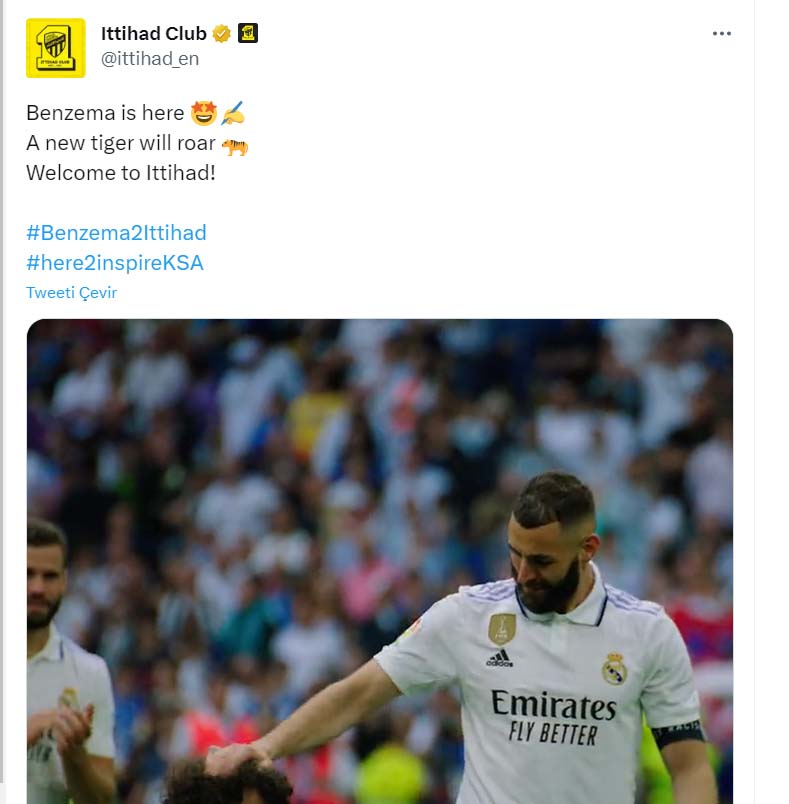 Haberi sosyal medyada duyuran kulüp, "Benzema burada. Yeni bir kaplan kükreyecek. İttihad'a hoş geldin!" paylaşımını yaptı.