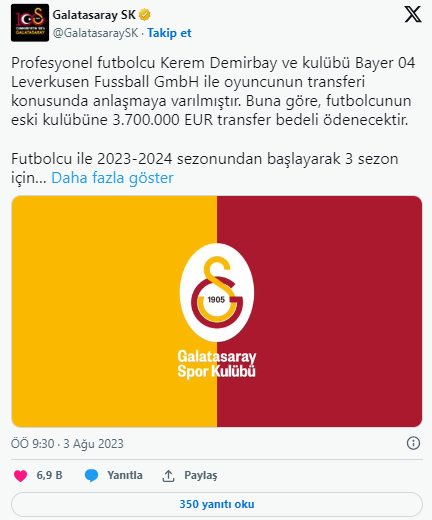 Galatasaray, Bayer 04 Leverkusen'den transfer ettiği Kerem Demirbay'ın maliyetini duyurdu.Galatasaray, Bayer 04 Leverkusen'den transfer ettiği Kerem Demirbay'ın maliyetini açıkladı.Her sezon için 1 MilyonYapılan açıklamada, "Profesyonel...