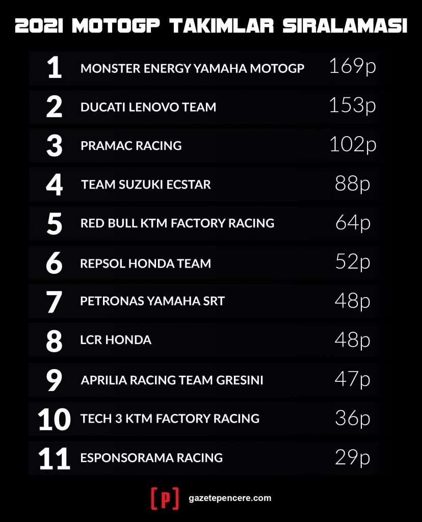 Yeni şasisiyle oldukça iyi bir hafta sonu geçiren KTM, Brad Binder’ın beşinci olmasıyla ilk 5’e iki motosiklet birden sokabilen tek üretici oldu. Hafta sonunun tuhaf olaylarından biri formasyon turunda yaşanan Johann Zarco’nun son düzlükte yavaş ilerlemesi ve Enea Bastianini’nin arkasından süratli gelerek Zarco’ya çarpması idi. Sert frenleme yapan Bastianini, Zarco’ya çarptı ve motosikletini değiştirmek üzere pite koştu ancak yarışa başlayamadı.