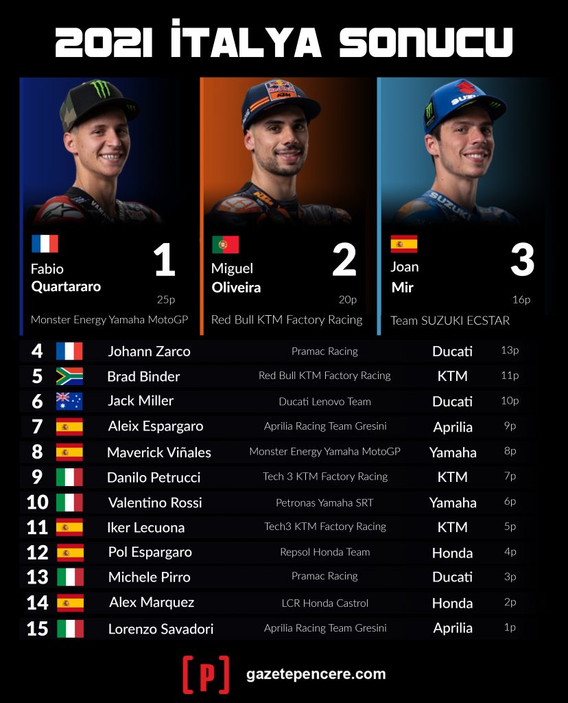 2021 MotoGP Şampiyonası’nda İtalya’nın Mugello pistinde gerçekleştirilen altıncı yarışta zafer Yamaha sürücüsü Fabio Quartararo’nun oldu. İkinci Red Bull KTM Factory Racing pilotu Miguel Oliveira olurken, üçüncü geçen senenin şampiyonu Suzuki pilotu Joan Mir oldu.