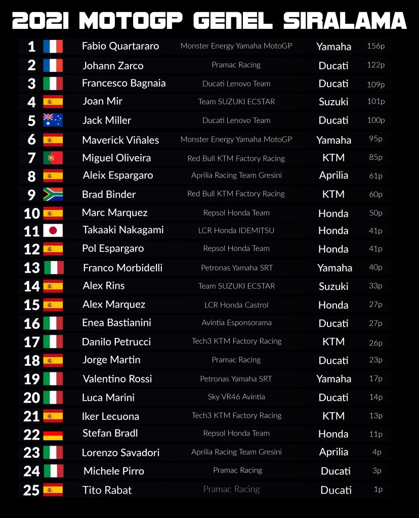 Geçen hafta Almanya yarışında iyi bir performans gösteren KTM pilotu Miguel Oliveira ise yarışı 11 puanla beşinci sırada tamamladı.