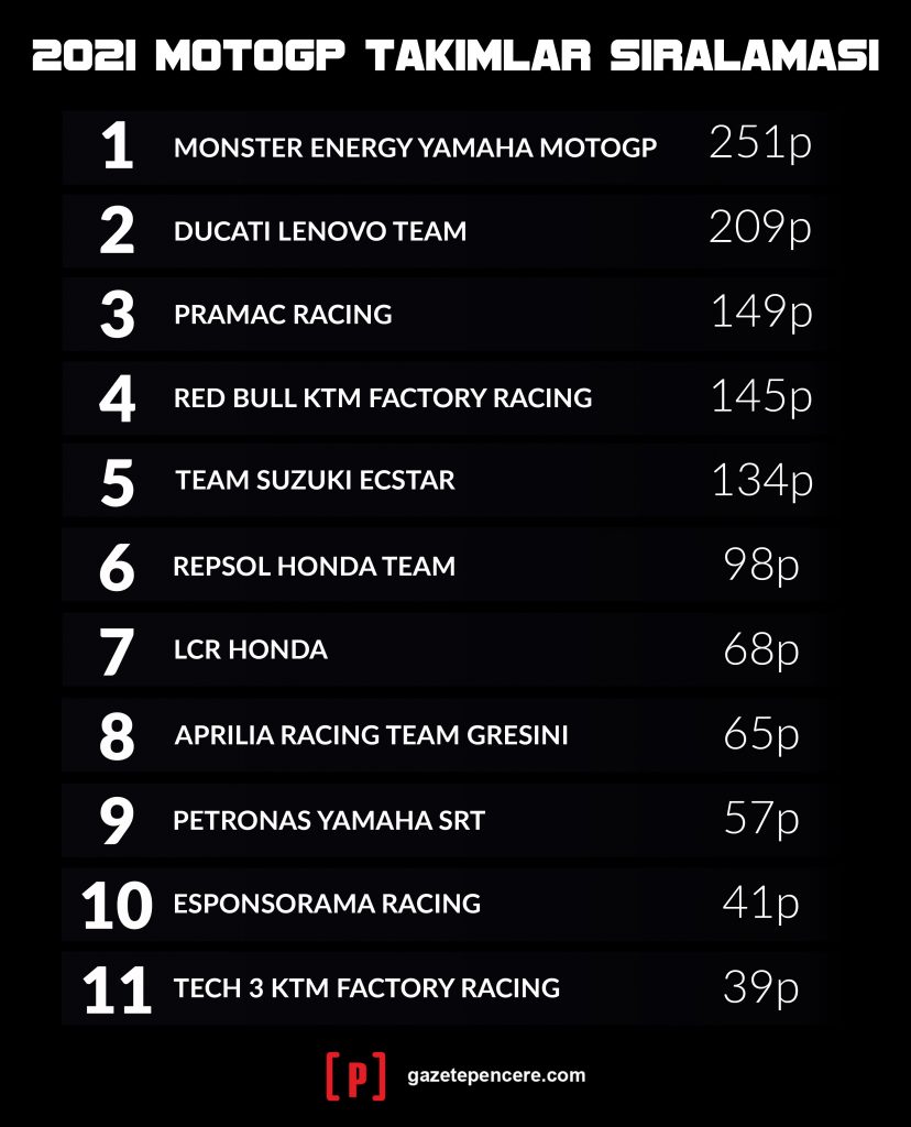Ducati’ler için pek de avantajlı olmayan pistte Johann Zarco yarışı dördüncü olarak tamamlarken takım arkadaşı Jorge Martin, motosikletinde yaşadığı arızadan ötürü yarıştan çekilmek zorunda kaldı.