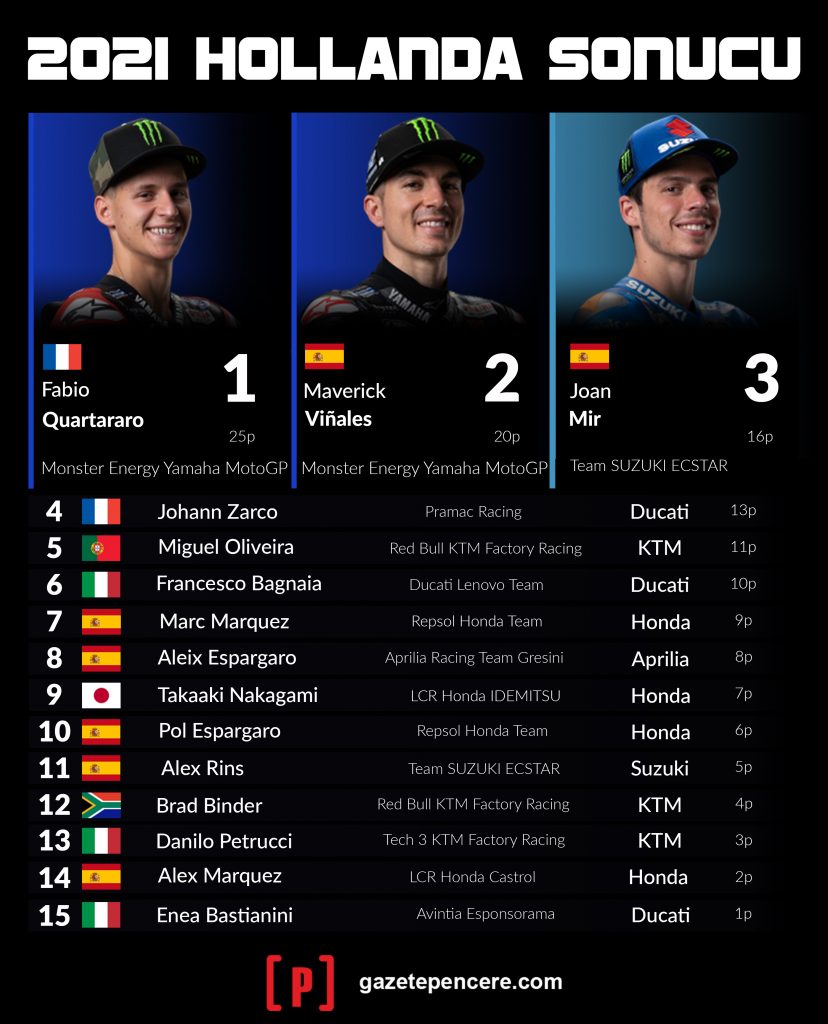 Sezonunun dokuzuncu yarışı MotoGP’nin ‘hız tapınağı’ Hollanda Assen’de yapıldı. Kazanan Yamaha sürücüsü Fabio Quartararo oldu. Quartararo’nun takım arkadaşı Maverick Vinales ikinci olurken, son MotoGP şampiyonu Joan Mir üçüncü oldu.