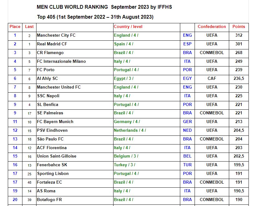 Uluslararası Futbol Tarihi ve İstatistikleri Federasyonu (IFFHS), 1 Eylül 2022 ile 30 Ağustos 2023 arasındaki Dünya Kulüpler sıralamasını yayınladı.