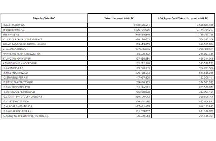 TFF, Süper Lig‘de harcama limitlerini açıkladı. Galatasaray ve Fenerbahçe‘nin limiti 1 milyar TL’nin üzerine çıktı.