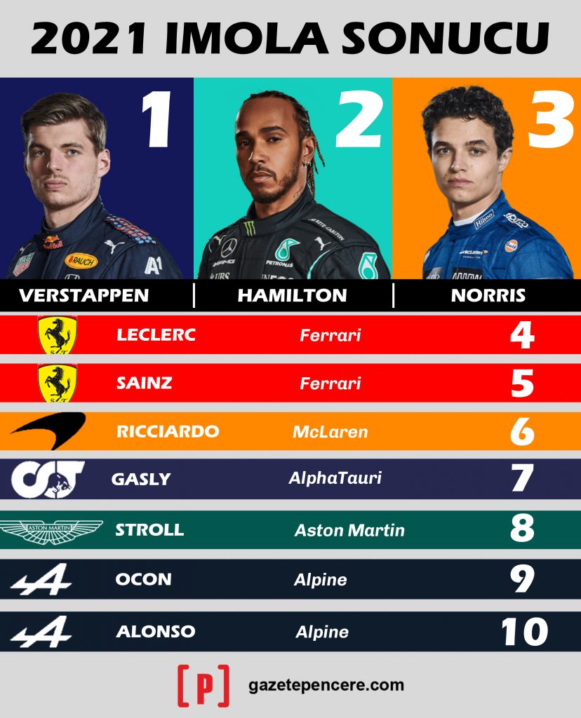 2021 Formula 1 sezonunun ikinci yarışı Imola, heyecanlı olaylara sahne oldu. Red Bull pilotu Max Verstappen yarışı birinci bitirerek kariyerinin 11. zaferini elde etti. Mercedes pilotu Lewis Hamilton ikinci, McLaren pilotu Lando Norris...