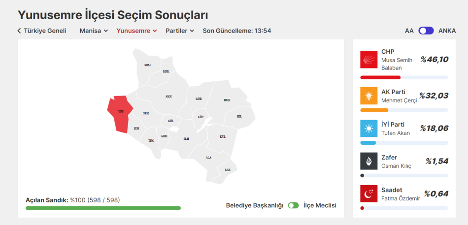CHP Genel Başkanı Özgür Özel’in de memleketi olan Manisa’da ise CHP MHP’yi geride bırakarak kazandı. CHP büyükşehir harici Manisa ilçelerinde rakiplerini geride bırakarak birçok merkezde birinci parti konumuna geldi. Bunlardan biri de Yunusemre ilçesi.