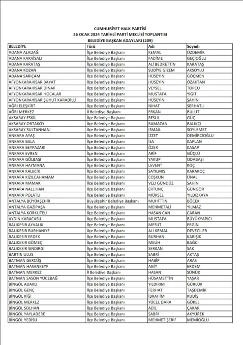 CHP'de yerel seçim için Merkez Yönetim Kurulu'nda (MYK) kararlaştırılan 209 isim, Parti Meclisi'nde (PM) oylanarak kesinleşti.
