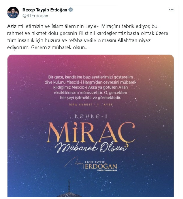Cumhurbaşkanı ve AKP Genel Başkanı Recep Tayyip Erdoğan, sosyal medya hesabı X'ten miraç kandili dolayısıyla mesaj yayımladı.