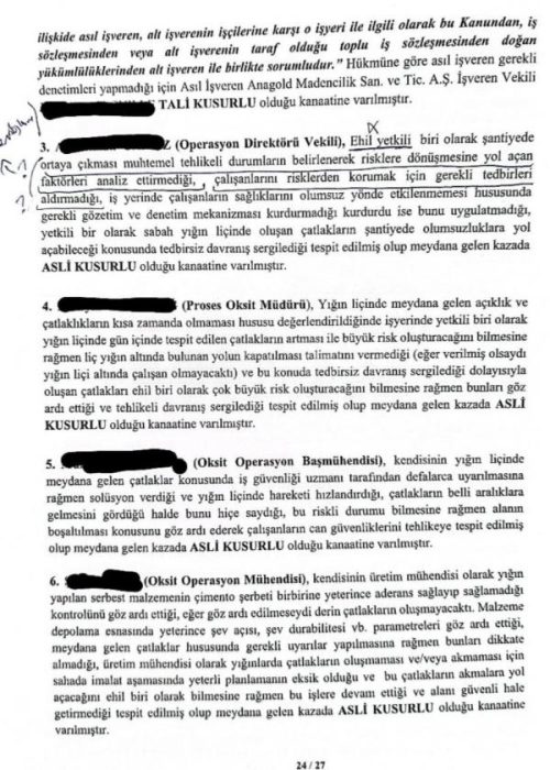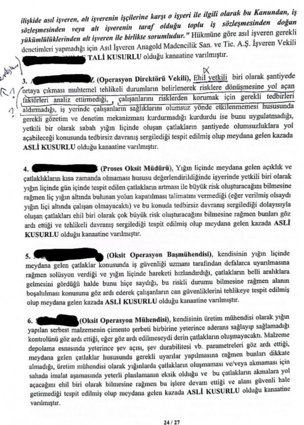 Ayrıca alt işveren şirketlerden Çiftay A.Ş'nin saha mühendisi ile saha formeni, Kar-Sa A.Ş.'nin formen ve mühendisi, Asil Çöpler A.Ş.'nin şirket müdürleri, saha süpervizörü, Asil Keklik A.Ş'nin şirket müdürleri ve saha süpervizörü sabah liçteki çatlakların tespit edilmesine rağmen tedbir almadıkları için tali kusurlu bulundu.