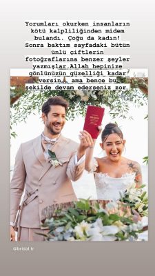 “Yorumları okurken insanların kötü kalpliliğinden midem bulandı. Çoğu da kadın! Sonra baktım sayfadaki bütün ünlü çiftlerin fotoğraflarına benzer şeyler yazmışlar. Allah hepinize gönlünüzün güzelliği kadar versin. Ama bence bu şekilde devam ederseniz zor…”