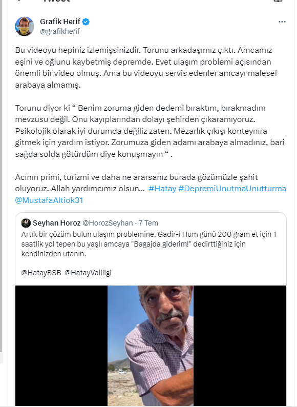 Kahramanmaraş merkezli depremlerden etkilenen Hatay’da, ulaşım sorunu olduğunu belirten depremzede vatandaşı videoya çekip, duygusal müzikle paylaşan kişilerin, yaşlı adamı araca almadıkları ortaya çıktı.