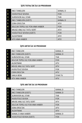AB'de 1.sırada “İnci Taneleri”, 2.sırada “İnci Taneleri” dizisinin özeti, 3.sırada “Survivor All Star” yer aldı.