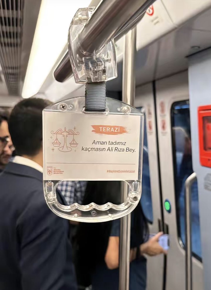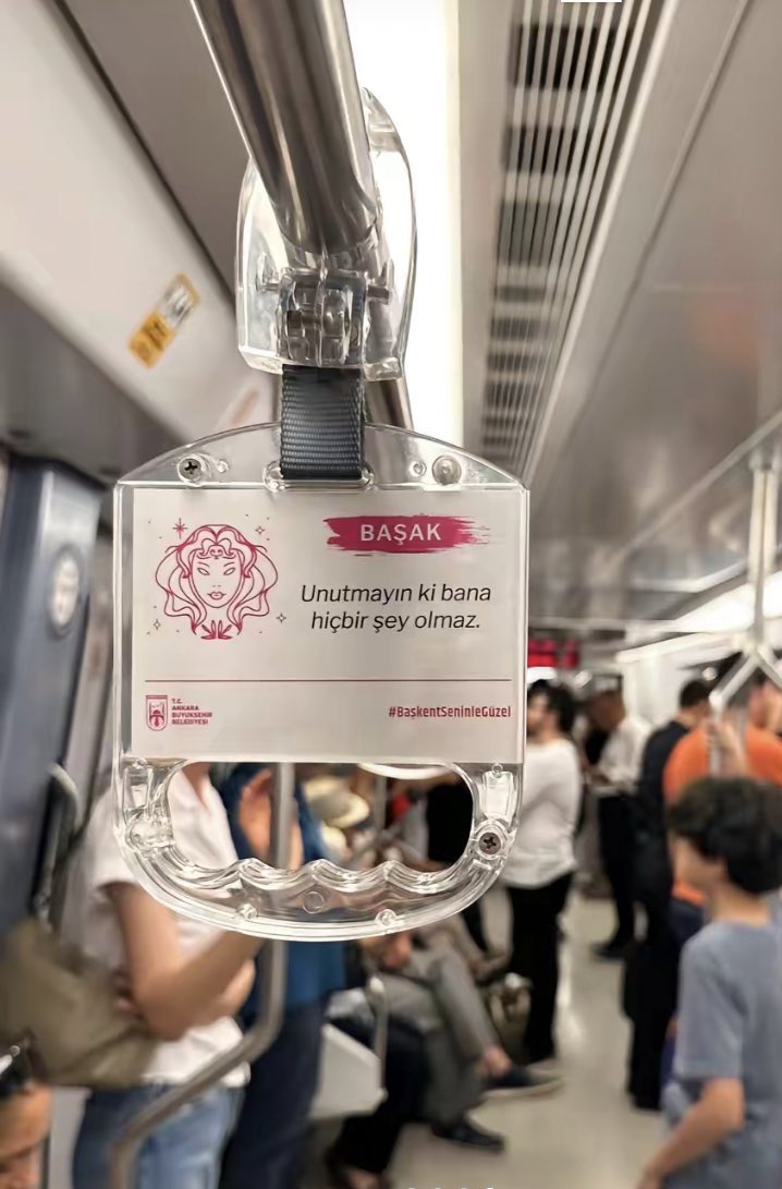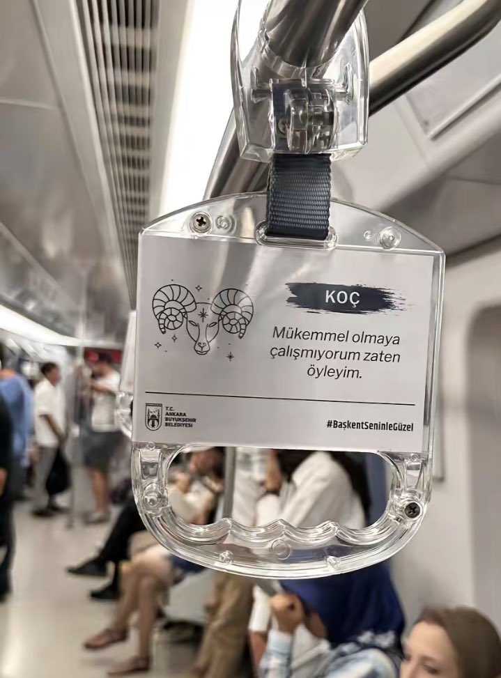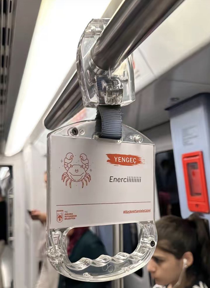 Ankara Büyükşehir Belediyesi, metrodaki tutacaklara burç yorumları ekledi.Her burcun altında o burca yönelik mesajların da yer aldığı etiketler sosyal medyada paylaşıldı.Etiketlerden bazılarında şunlar yazıyor:"Yengeç burcu...