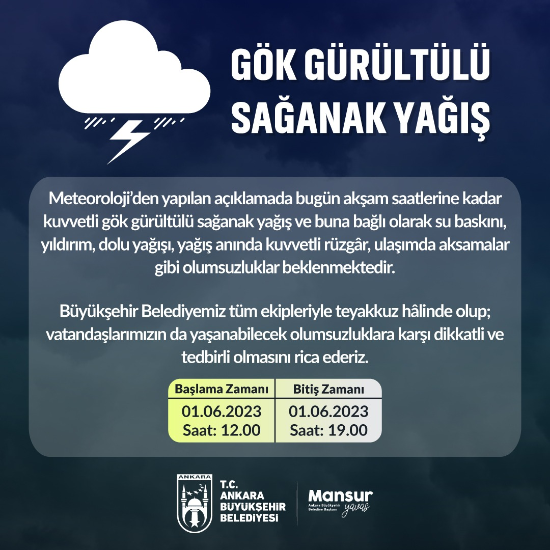 Ankara Büyükşehir Belediyesi, bugün akşam saatlerine kadar kuvvetli gök gürültülü sağanak yağış beklendiğini belirterek, uyarılarda bulundu.