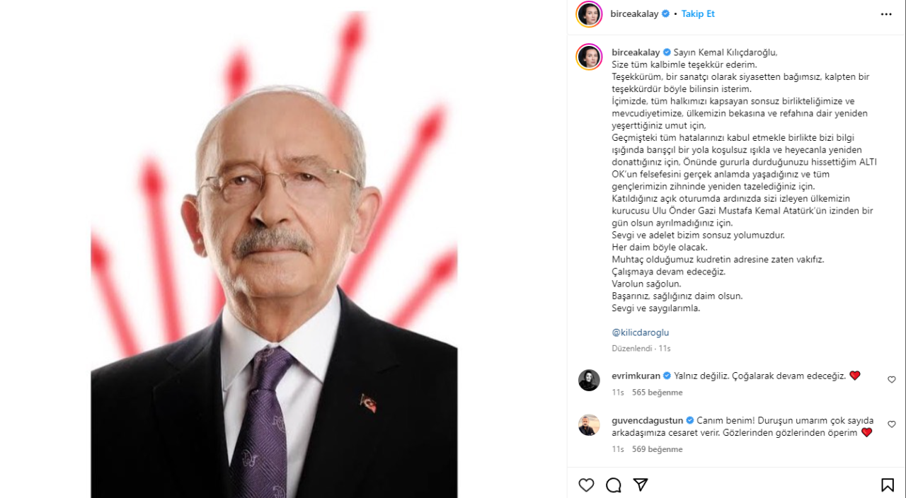 Oyuncu Birce Akalay, sosyal medya hesabından Millet İttifakı'nın cumhurbaşkanı adayı ve CHP Genel Başkanı Kemal Kılıçdaroğlu'na seslendiği bir mektup yazarak teşekkür etti. Akalay, "Size tüm kalbimle teşekkür ederim. Sevgi ve adalet bizim sonsuz yolumuzdur" dedi.