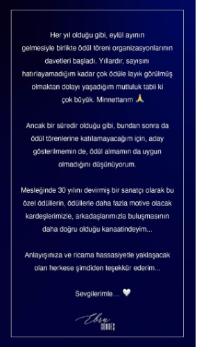 "Her yıl olduğu gibi eylül ayının gelmesiyle birlikte ödül töreni organizasyonlarının davetleri başladı. Yıllardır sayısını hatırlamadığım kadar çok ödüle layık görülmüş olmaktan dolayı yaşadığım mutluluk çok büyük. Ancak bir süredir olduğu gibi bundan sonra da ödül törenlerine katılamayacağım için aday gösterilmemin de ödül almamın da uygun olmadığını düşünüyorum.