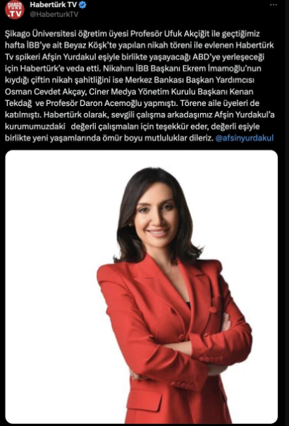 "Şikago Üniversitesi öğretim üyesi Profesör Ufuk Akçiğit ile geçtiğimiz hafta İBB’ye ait Beyaz Köşk’te yapılan nikah töreni ile evlenen Habertürk Tv spikeri Afşin Yurdakul eşiyle birlikte yaşayacağı ABD’ye yerleşeceği için Habertürk’e veda etti.