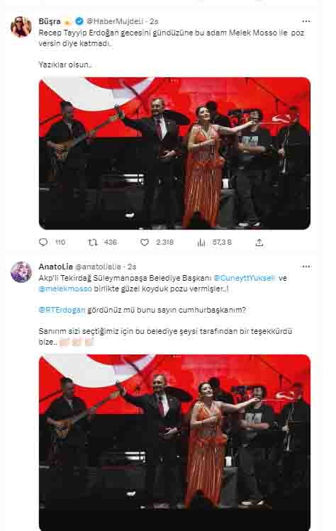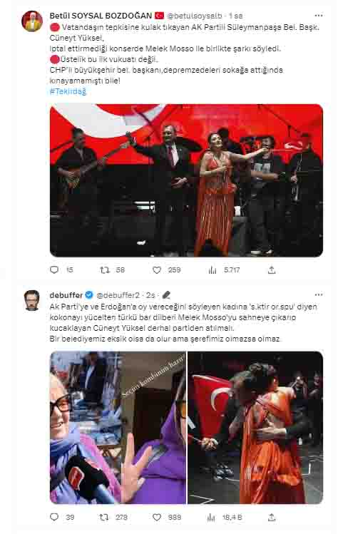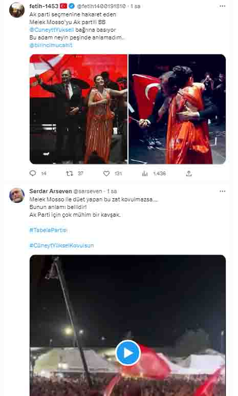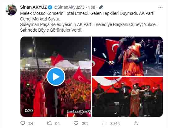 Tekirdağ Uluslararası Kiraz Festivali’nde AKP'li belediye başkanı ile birlikte sahneye çıkan Melek Mosso özür diledi. Mosso'nun özür dilemesinin ardından konuşan AKP'li Süleymanpaşa Belediye Başkanı Cüneyt Yüksel, "“Biz...