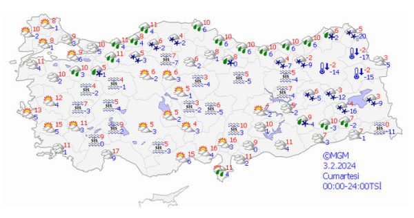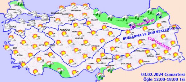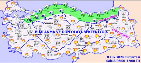 Yağışların kıyılarda yağmur ve sağanak yağışlı, iç kesimlerde kar ve karla karışık yağmurlu geçeceği bekleniyor. İç ve doğu bölgelerde pus ve yer yer sis ile birlikte buzlanma ve don olayı bekleniyor. Doğu Karadeniz'in iç kesimleri ile Doğu Anadolu'nun kuzey ve doğusunda çığ tehlikesi bulunmaktadır.