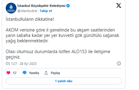 "İstanbulluların dikkatine! AKOM verisine göre il genelinde bu akşam saatlerinden yarın sabaha kadar yer yer kuvvetli gök gürültülü sağanak yağış beklenmektedir. Olası olumsuz durumlarda lütfen ALO153 ile iletişime geçiniz."