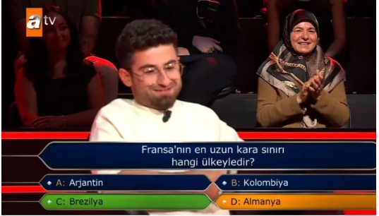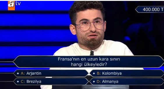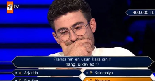 11'inci 400 bin liralık soruya kadar ulaşan yarışmacının karşısına, "Fransa'nın en uzun kara sınırı hangi ülkeyledir?" sorusu çıktı.
