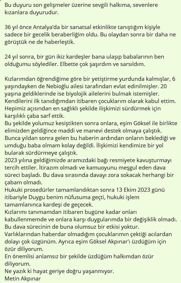 "Bu duyuru son gelişmeler üzerine sevgili halkıma, sevenlere kızanlara duyurudur. 36 yıl önce Antalya’da bir sanatsal etkinlikte tanıştığım kişiyle sadece bir gecelik beraberliğim oldu. Bu olaydan sonra bir daha ne görüştük ne de haberleştik. 24 yıl sonra, bir gün ikiz kardeşler bana ulaşıp babalarının ben olduğumu söylediler. Elbette çok şaşırdım ve sarsıldım.