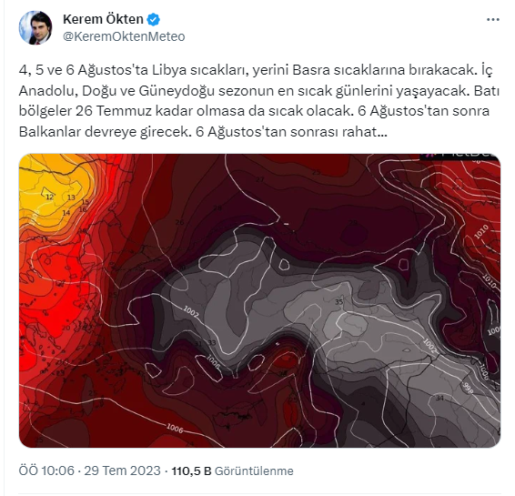 "4, 5 ve 6 Ağustos’ta Libya sıcakları, yerini Basra sıcaklarına bırakacak. İç Anadolu, Doğu ve Güneydoğu sezonun en sıcak günlerini yaşayacak. Batı bölgeler 26 Temmuz kadar olmasa da sıcak olacak. 6 Ağustos’tan sonra Balkanlar devreye girecek. 6 Ağustos’tan sonrası rahat…"