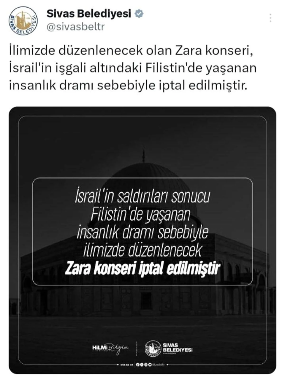 Sivas Belediyesi'nin sosyal medya hesaplarından yapılan açıklamada, "İsrail'in saldırıları sonucu Filistin'de yaşanan insanlık dramı sebebiyle ilimizde düzenlenecek olan Zara konseri iptal edilmiştir" ifadelerine yer verildi.