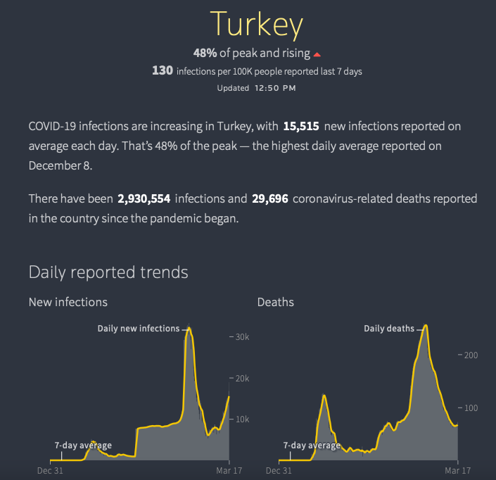 TÜİK raporlarına göre Türkiye nüfusu 83 milyon 154 bin 997 kişi, şu ana kadar aşılanan kişi sayısı ise, 4 milyon 658 bin 084. Bu durumda şu ana kadar iki doz aşı alanların nüfusa oranı yüzde5. Reuters’in sayfasında yapılan hesaplamaya göre Türkiye’nin yüzde 10’unun iki doz aşı için geçmesi gerek süre ise 105 gün. (