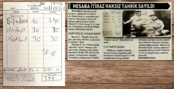 - TV’lerdeki dizi ve filmlerinde alkollü içecek görüntüsünün flulaştırılmasından sonra bu kez Sabah gazetesi de “Hesaba itiraz haksız tahrik sayıldı” haberinde fatura fotoğrafındaki “bira” sözcüğünü kapattı.