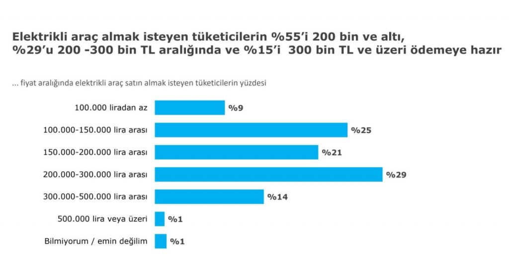 Yapılan bir araştırmaya göre Türkiye’de tüketicilerin %55’i elektrikli bir otomobil için 200 bin TL ve altında fiyat ödemeye hazır. Türklerin %9’u 100 bin TL ve altında, %25’i 100-150 bin TL arası, %21’i 150-200 bin TL arası, %29’u ise 200-300 bin TL arasında ödeyebileceğini söylemiş. Bu fiyatların gerçeğe dönüşebilmesi için ise teşvik şart.