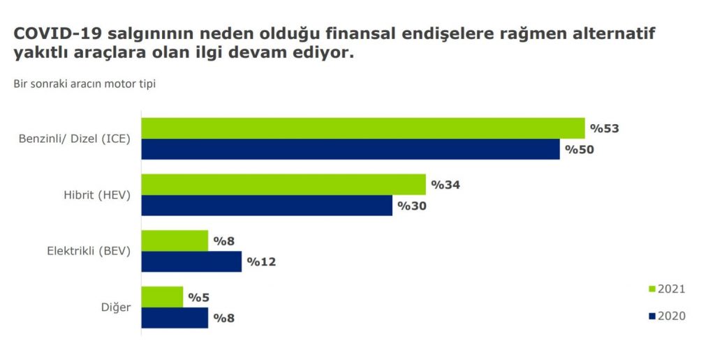 Tüketicilerin bir sonraki araç tercihleri ülkeler arasında önemli farklılıklar gösteriyor. Türkiye’de araştırmaya katılan tüketicilerin yüzde 53’ü benzinli/dizel, yüzde 34’ü hibrit, yüzde 8’i tamamen elektrikli ve yüzde 5’i ise diğer yakıt türlerini kullanan bir otomobil tercih edebileceğini belirtiyor. Bu da Türkiye’nin Japonya’dan sonra en çok hibrit ve elektrikli araç tercih ettiğini ortaya koyuyor. Sadece hibrit tercihinde Türkiye, Japonya’dan sonra ikinci sırada yer alırken, elektrikli araç tercihinde ise yüzde 8 ile Çin’den sonra ikinci sırada yer alıyor. Aslında Türkiye’de elektrikli araç tercihi 2020’de yüzde 12’den yüzde 8’e düşmüş. Bunda da şubat başı yapılan ÖTV zamlarının etkisi olduğunu tahmin ediliyor.