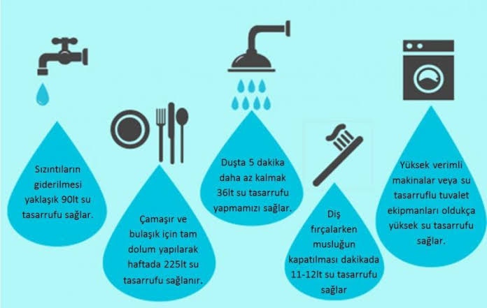 Sırasıyla su kullanımındaki hatalardan bahsedilmiş. Mesela diş fırçalarken günde kaç litre suyun israf olmasına sebep olduğumuzdan, bulaşık makinesine koymadan bulaşıkları musluktan geçirmenin yarattığı israfa kadar birçok başlık var.