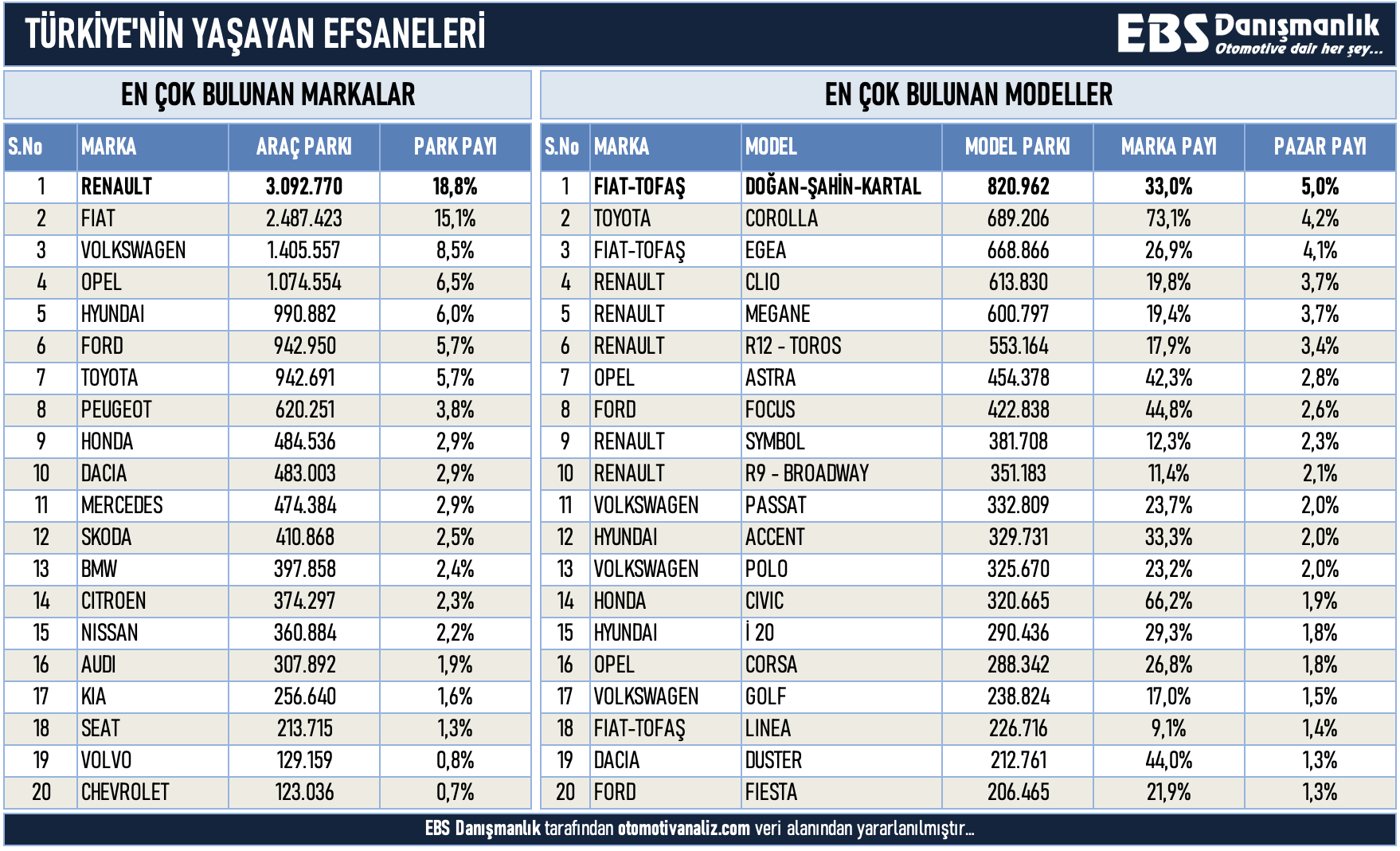 Verilere göre Türkiye’de en çok bulunan marka Renault (3 milyonun üzerinde) ve onu Fiat takip ediyor. Her iki marka da hem geçmişte hem bugün, yerli üretim ile halkın ulaşabildiği modeller sunmasıyla dikkat çekiyor. Aynı zamanda dayanıklılıklarıyla da uzun ömürlü birer yol arkadaşı olduklarını ispatlamış durumdalar. Listede bugün hâlâ ilk sıralarda yer alan modeller arasında Clio, Egea ve Megane gibi daha güncel araçlar bulunsa da, Doğan, Şahin, R12, R9, Symbol gibi nostaljik modeller de hâlâ ciddi sayılarda trafikte karşımıza çıkıyor. Bu da Türkiye’nin sadece yeni olanı değil, eski ama çalışır olanı da sahiplendiğini gösteriyor.