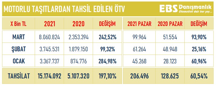 Otomotiv pazarı martta %93 büyürken, devletin ÖTV tahsilatı ise %242 artarak 8 milyar TL›yi geçti. İlk çeyrekte ise %97 artışla 15.1 milyar TL ÖTV toplandı. Böylece ÖTV tahsilatında yeni lider petrol ile tütünlü mamülleri geçen otomotiv sektörü oldu.