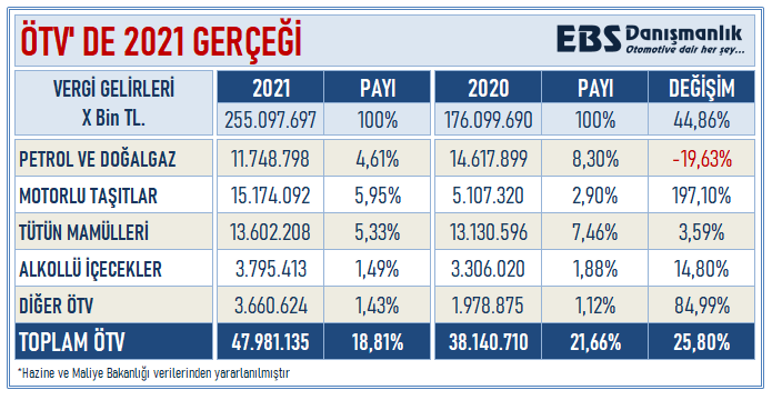 2021 yılının ilk çeyreğinde devletin ÖTV gelirleri 2020 yılının aynı dönemine göre yüzde 25.8 oranında artarak 48 milyar TL’ye ulaştı. ÖTV tahsilatında ise yeni lider motorlu taşıtlar yani otomotiv sektörü oldu. Artan ÖTV yükü Türkiye’de insanları kaçak içki, sigara ve akaryakıta yönlendirirken, bu alanlarda yaşanan kayıplar kendini tahsilatta gösterdi.