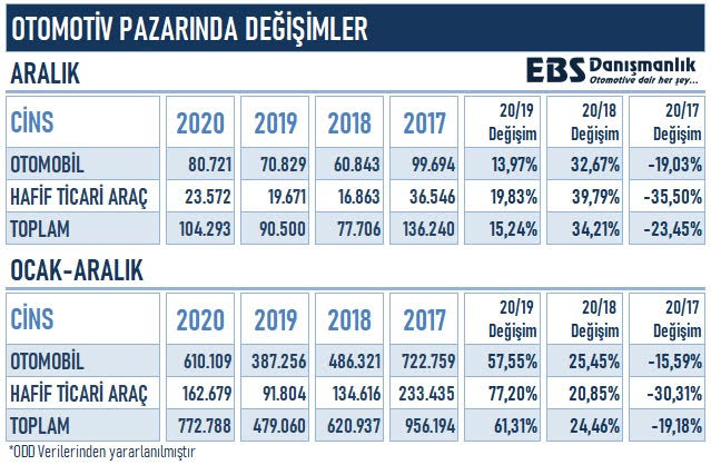 Aralık ayında otomobil satışları bir önceki yılın aynı ayına göre %14,0 artarak 80.721 adet olurken, hafif ticari araç pazarı %19,8 artarak 23.572 adet oldu. Otomobil ve hafif ticari araç pazarı, 10 yıllık Aralık ayı ortalama satışlarına göre %17,9 azaldı. Otomobil pazarı, 10 yıllık Aralık ayı ortalama satışlara göre %13,6 azalış gösterdi. • Hafif ticari araç pazarı, 10 yıllık Aralık ayı ortalama satışlara göre %30,0 azaldı.
