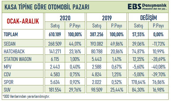 ODD verilerine göre, 2020’de pazarın yüzde 87.6’sını vergi oranları düşük olan A, B ve C segmentlerindeki araçlar oluşturdu. C segmenti otomobiller 384 bin 457 adetle yüzde 63 pay sahibi olurken, B segmenti otomobiller ise 146 bin 821 adetle pazardan yüzde 24.1 pay aldı. Gövde tiplerine göre değerlendirildiğinde ise en çok tercih edilen gövde tipi yine sedan otomobiller oldu. Sedan otomobillerin pazar payı yüzde 44’e gerilerken, sedanları yüzde 29.8 paya çıkan SUV gövde tipi takip etti.