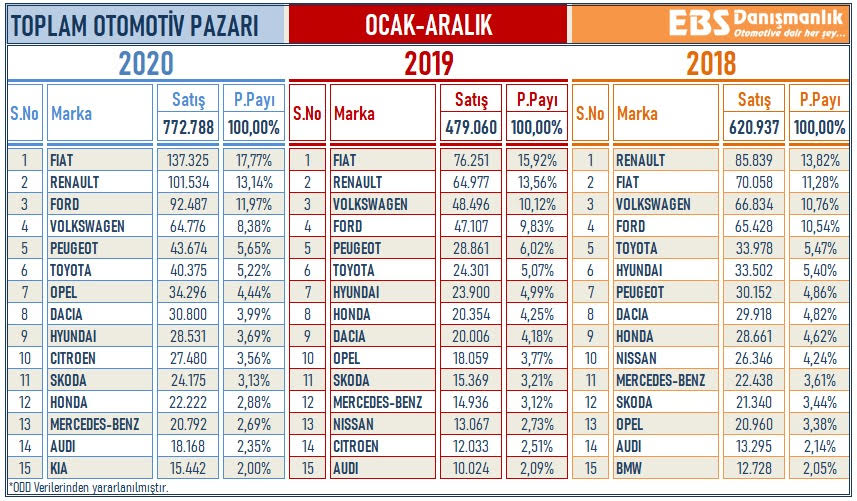 Türkiye’de ekonominin lokomotifi otomotiv pazarı pandemiden dolayı çok zor geçen 2020 yılını büyüyerek atlattı. Tüm dünyada otomotiv satışları düşerken, pozitif ayrışan Türkiye’de otomotiv pazarı yüzde 61,3 artışla yılı 772 bin 788 adetle kapattı. Bu da son 3 yılın en iyi sonucu oldu. Ama kasımda başlayan ritm bozukluğunun aralıkta devam etmesi, 2021’de işlerin pek de yolunda gitmeyeceğinin göstergesi…