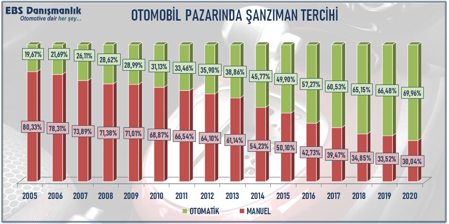 2005 yılında her 100 otomobil satışının 19 adedi otomatik vites iken, 2020 yılında oran 70 adede çıktı. Bu da 15 yılda artışın yüzde 255 olduğunu gösteriyor.