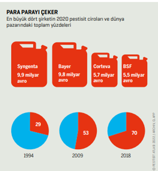 Dünyanın en büyük şirketleri arasında yer alan Bayer, Syngenta, Basf, Corteva ve FMC’nin Türkiye’deki 2018 yılı satış gelirleri 68 milyon dolar. Bu gelirin yüzde 16’sı insan sağlığına ve ekosisteme zarar veren son derece tehlikeli pestisitlerin satışından elde ediliyor. .